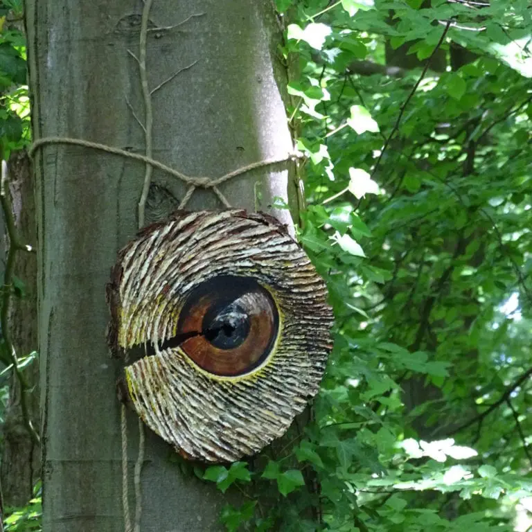“Jazeker! De kunst omvat een serie boomschijven met schors die zijn beschilderd met ogen van verschillende dieren die je in het bos zou kunnen tegenkomen. Ogen die je aankijken.