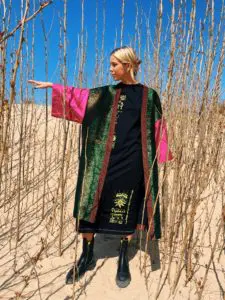 Op TMO heb ik veel geleerd over duurzaamheid en dat is een van de redenen dat ik op dit idee ben gekomen. De kimono’s worden namelijk gemaakt van stoffenoverschotten van exclusieve Belgische merken zoals Dries van Noten en Essentiel Antwerp. Ik maak daar unieke stuks mee. Niet zelf, maar een klein confectieatelier in België dat o.a. ook voor Natan dingen doet. Zij maken de kimono’s met de hand en van elk ontwerp worden er maximaal 5 gemaakt. Exclusief en duurzaam dus! Omdat zowel de inkoop als de productie duurzaam zijn en ik alleen met topkwaliteit stoffen werk, is de kimono niet goedkoop. De prijs ligt op 495 euro per stuk. Maar je doet er jaren mee en – wat ik al zei – de stoffen zijn zeer exclusief. Je ziet dat ook af aan het luxe label dat in de kimono wordt genaaid. Deze laat ik speciaal maken in Italië.