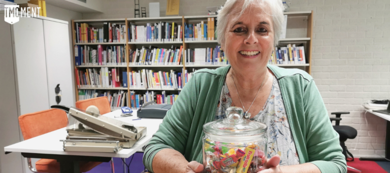 Toen Ineke werd gevraagd het Informatiecentrum te versterken, sprong ze een gat in de lucht. Met haar pabo-diploma en liefde voor onderwijs kon zij zich geen passendere baan voorstellen. ‘Ik wilde eigenlijk altijd al in het Informatiecentrum werken dus toen ik de baan van mijn voorganger kreeg aangeboden, hoefde ik niet lang na te denken. Ik heb er geen moment spijt van gehad. Ik ben iedere dag fluitend naar mijn werk gegaan, hoewel het afgelopen coronajaar natuurlijk zwaar en een stuk minder leuk was. Alles ging online en ik zag nauwelijks studenten. Dat maakte mijn werk wel een stuk minder boeiend, want de belangrijkste functie van het IC is toch het helpen, adviseren en soms ook steunen van de student. Ze komen hier met de meest uiteenlopende zaken; van het lenen van boeken, het inzien van scripties en het studeren tot het maken van een babbeltje en het luchten van hun hart. En dan komt onze befaamde snoeppot om de hoek kijken.’